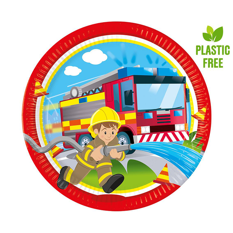 Χάρτινο πιάτο 23cm με έναν χαμογελαστό πυροσβέστη και το όχημά του. Συσκευασία 8τμχ.