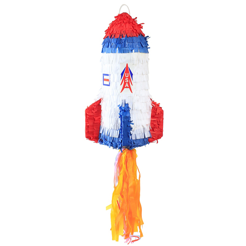 Pinata pull πύραυλος με πολύχρωμες κορδέλες και ουρά!. Δεν χρειάζεται χτύπημα. 40cm x 27 cm x 27cm.